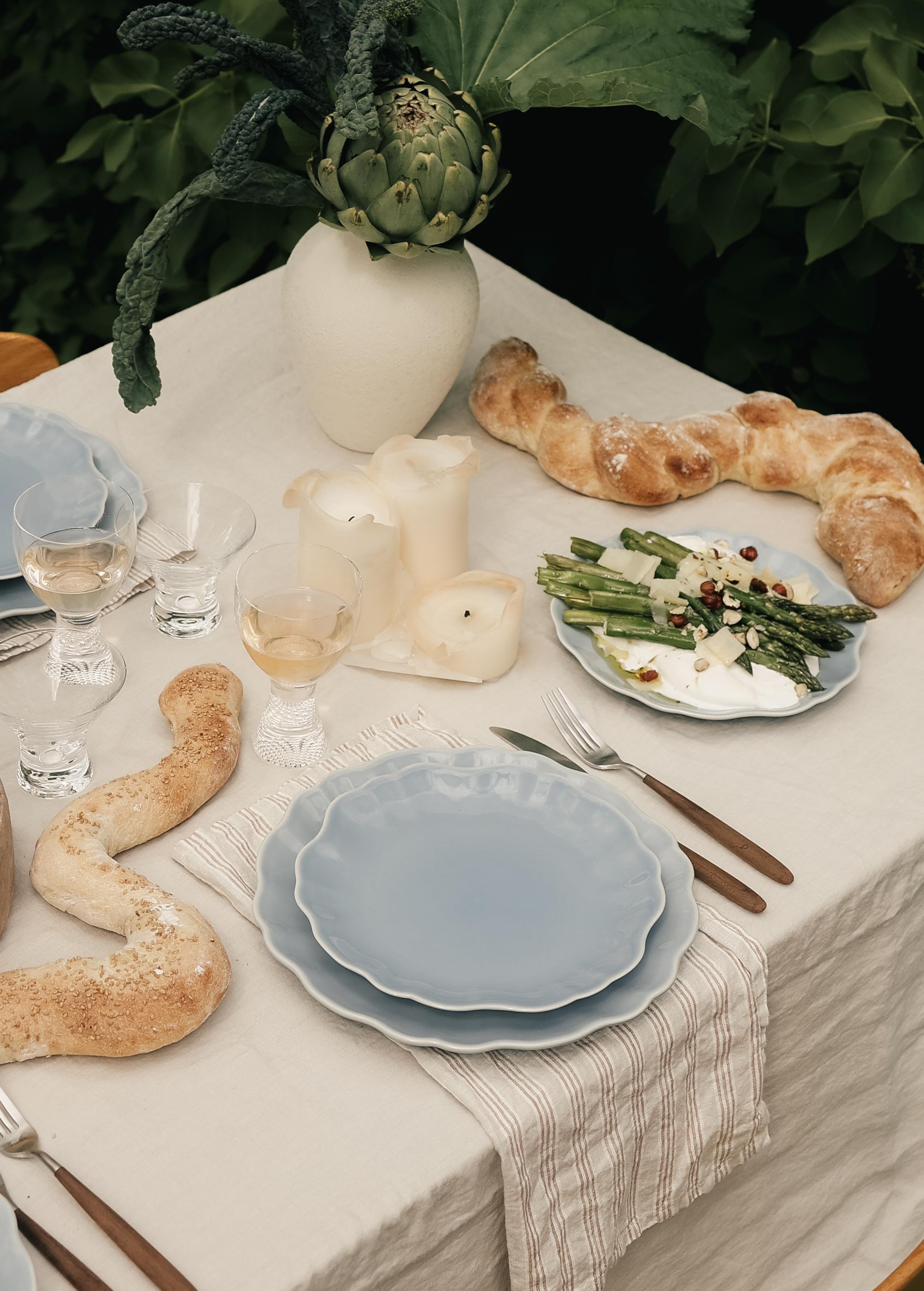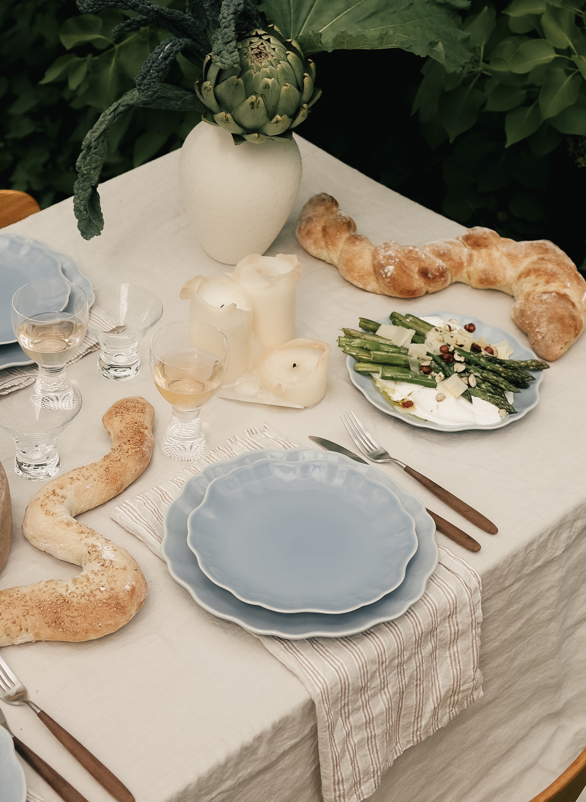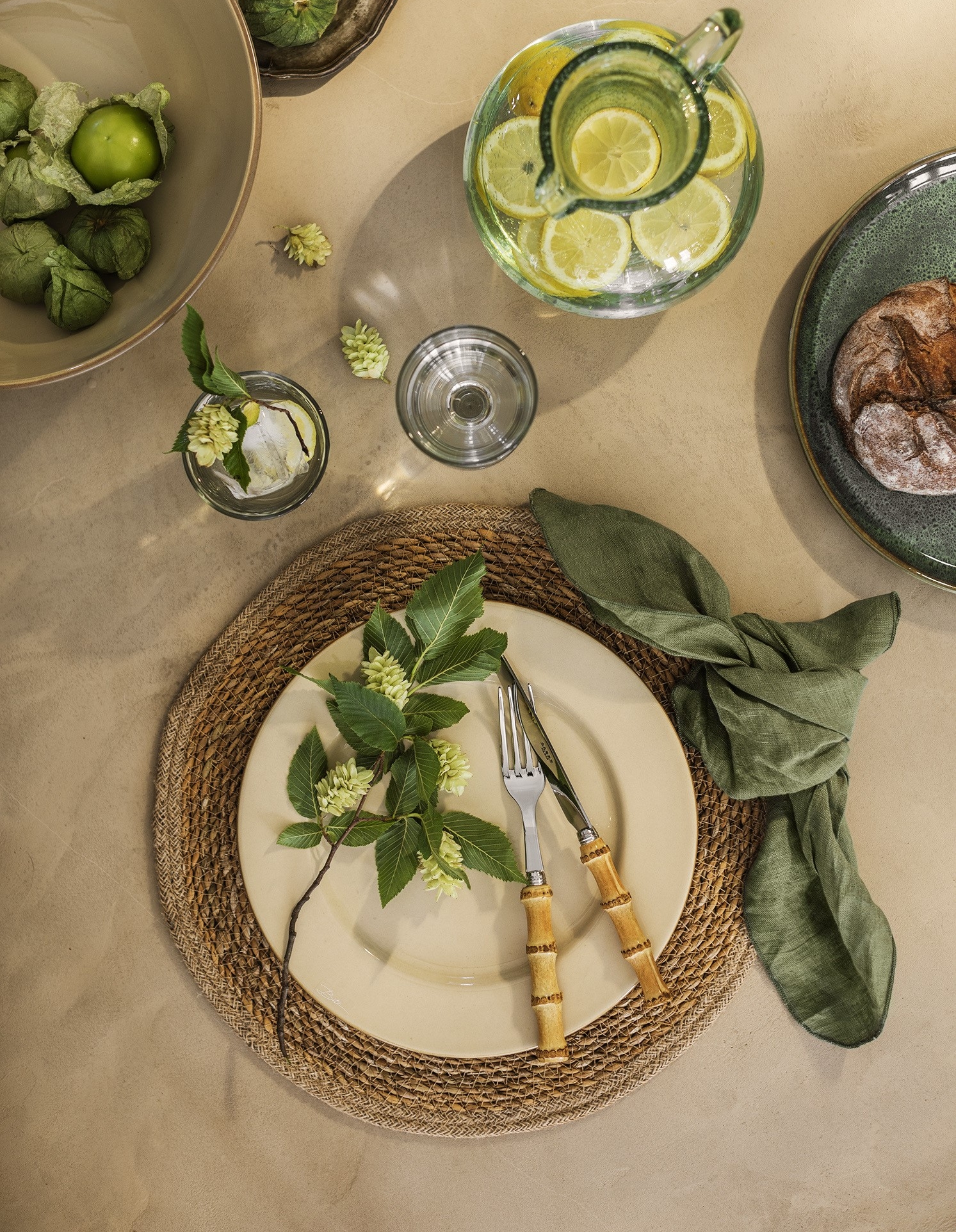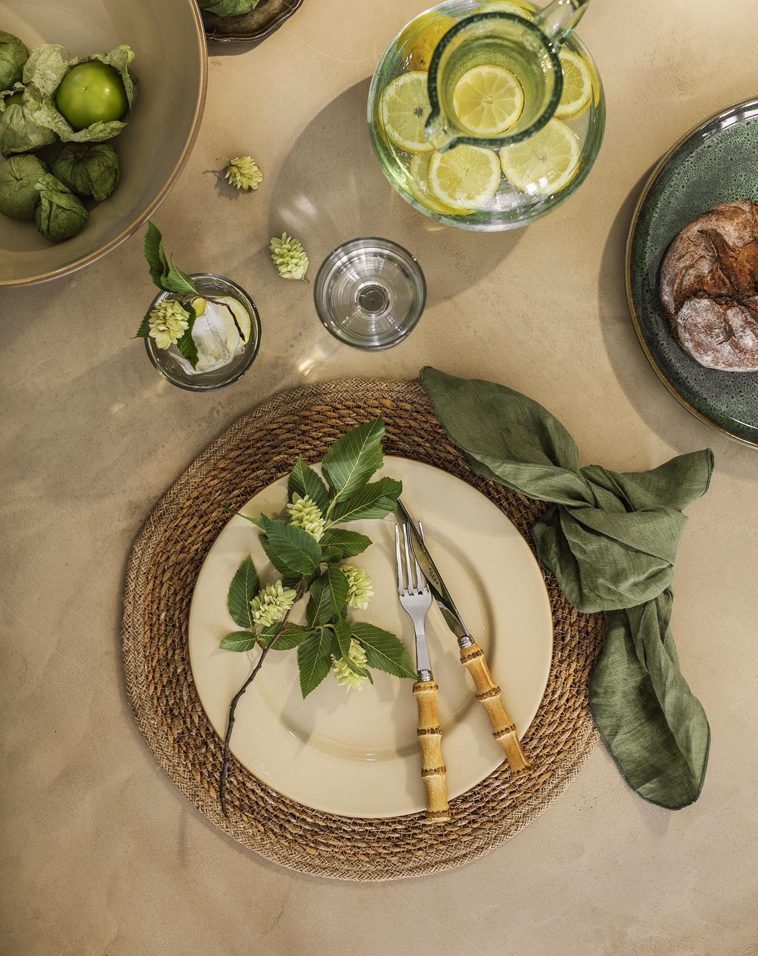 Koristeluun: Käytä esimerkiksi parsakaalta tai artisokkaa korvikkeena kukille, jotka leikkaat kauniisti maljakkoon. Loppujen lopuksi vain mielikuvitus asettaa rajat sille, miten voit koristella syötävillä asioilla sensommerin aikana! Kata pöytä luonnon väreissä ja mikset käyttäisi voimakasta vihreää korostuksena, esimerkiksi posliinissa, jota yhdistät puumaisiin elementteihin, pellavaan ja olkiin. Ajattele olevasi yhtä luonnon kanssa, kun kattat pöytää.