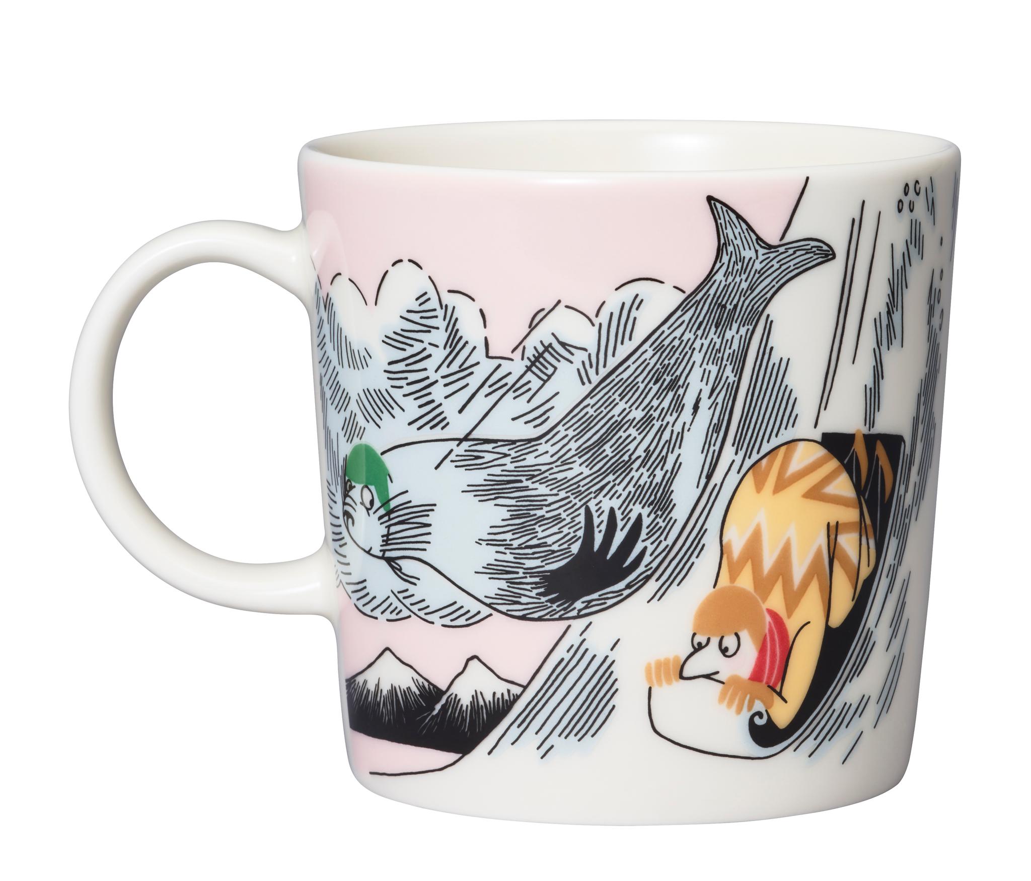 Mukin etupuolella näemme Muumipeikon, joka on valinnut mäenlaskuun sukset, sekä Muumipapan, joka on päättänyt liukua alas vatsallaan. Mäenrinteellä istuu myös tummaturkkinen pieni Samu, joka seuraa Muumien kilpailua. Luminen mäki jatkuu mukin toisella puolella, jossa näemme herra Virkkusen ja mursu Edwardin kiitävän alas mäkeä.