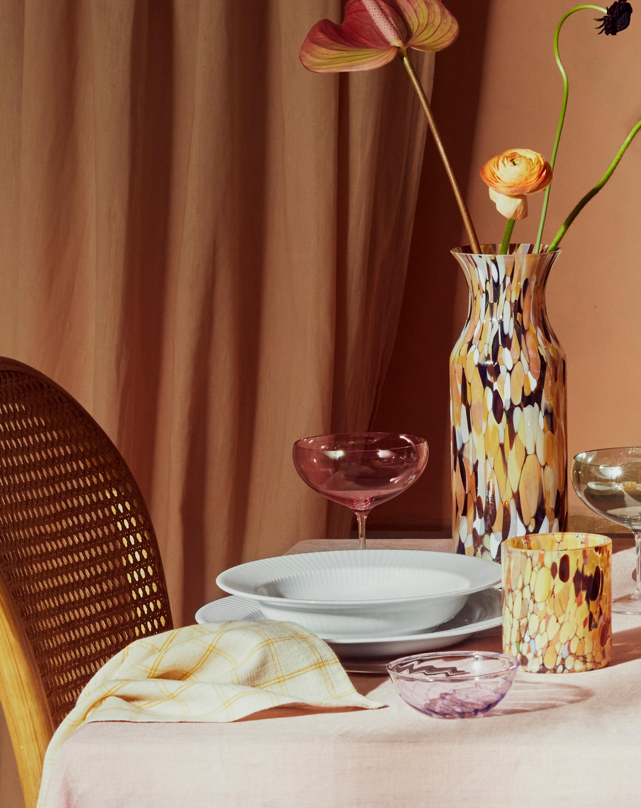 Läpinäkyvät juomalasit ovat olleet huomion kohteena monen sesongin ajan. Nyt on kuitenkin korkea aika koristella kattaus värikkäillä laseilla, mielellä kaikissa sateenkaaren väreissä. Sopisiko merensininen, rauhoittavan vihreä tai trendikkään violetti? Värikkäät juomalasit ovat upea yksityiskohta pöydän kattauksessa. Sekoittele myös rohkeasti värillistä ja kirkasta lasia, esimerkiksi yhdistelemällä värikkäitä juomalaseja klassisten viinilasien kanssa, saadaksesi kauniin ja näyttävän kattauksen, joka kohottaa illallisen tunnelmaa. Käytä kattauksissa vapaasti mielikuvitusta, jolloin lopputulos on taatusti persoonallinen!
