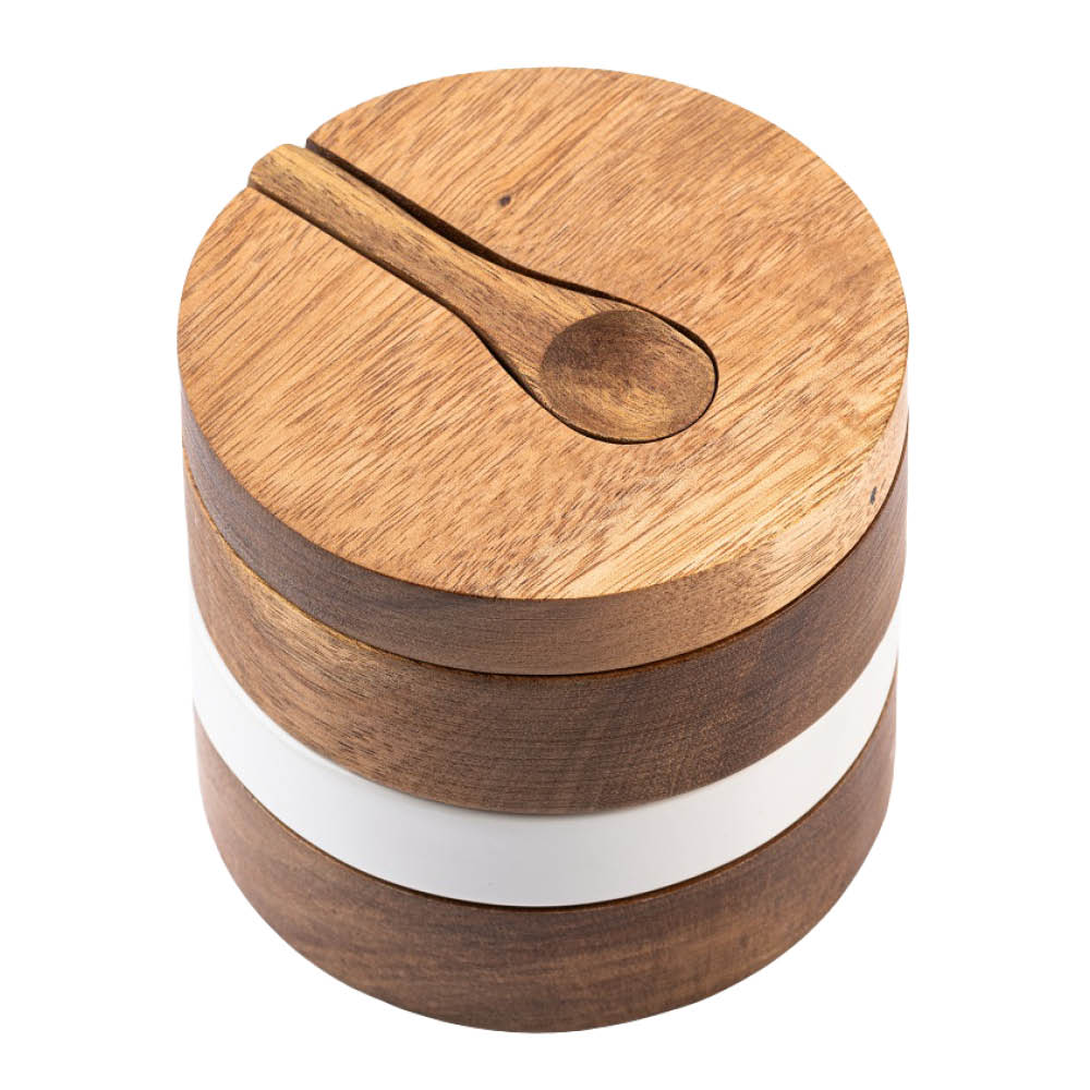 Öljykulho sopii täydellisesti maustetulle oliiviöljylle tai balsamietikalle. Puinen voikulho tuo luonnollista tunnelmaa pöytään, ja suljettu maustekulho pitää sisällön tuoreena.
